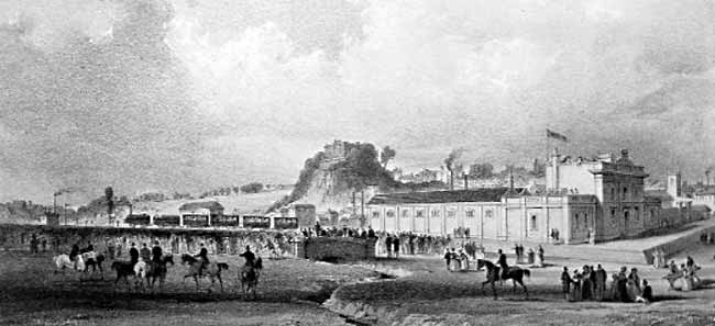 1843. The Midland Counties Railway Station on Carrington Street, Nottingham. Before the road bridge across the canal was built in 1841, entrance to the station was from Wilford Road. Only the two gate posts of the station now remain.
